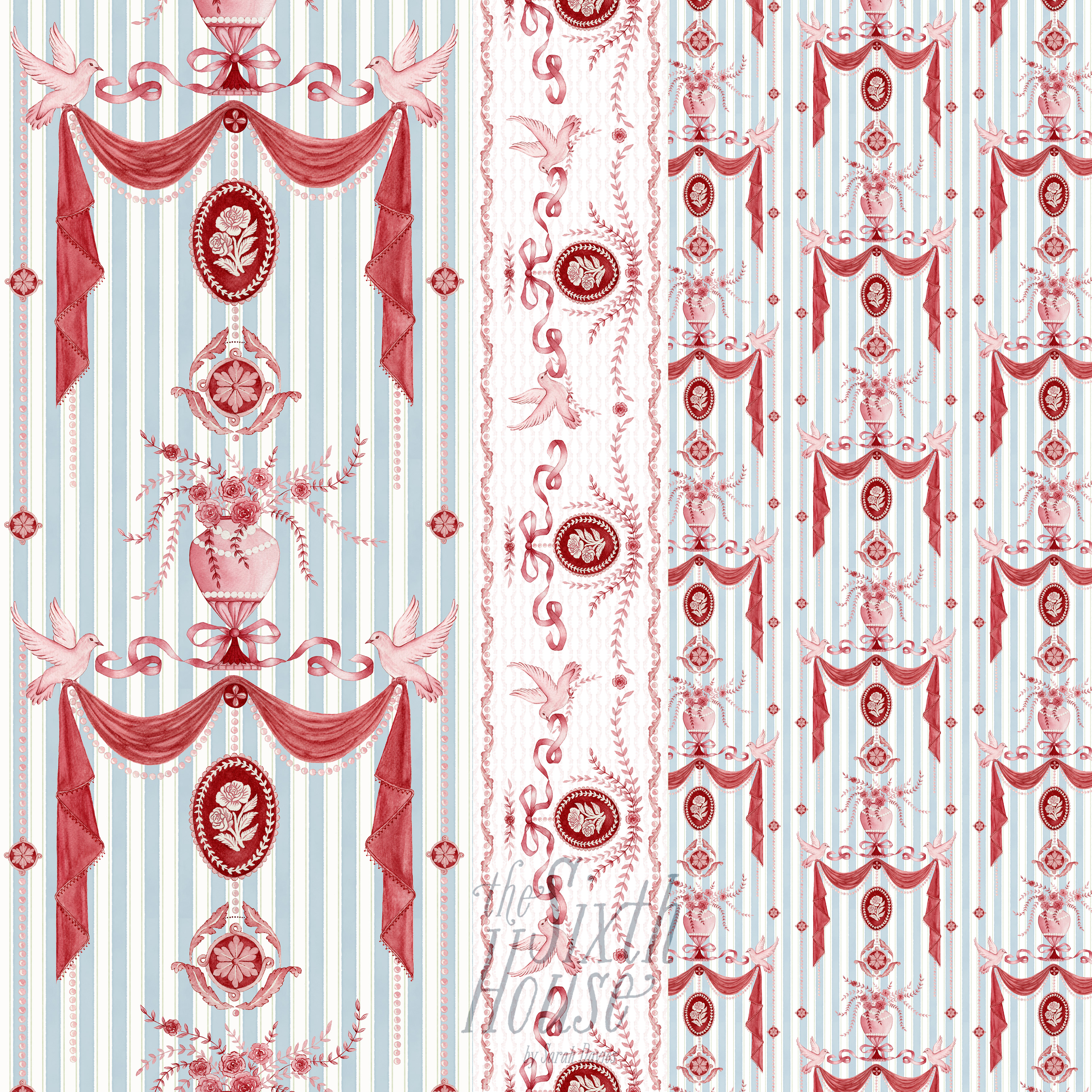 The collection draws on neoclassical interiors and reinterprets them in a more playful and expressive way. Traditional elements, including stripes, florals, medallions, and trompe-l’œil panel designs, are used throughout to evoke the illusion of drapery and the intricate detailing found in historic interiors.